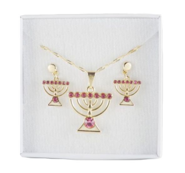 Conjunto menorah de brinco + pingente + corrente. Com strass, folheado a ouro 18 K
